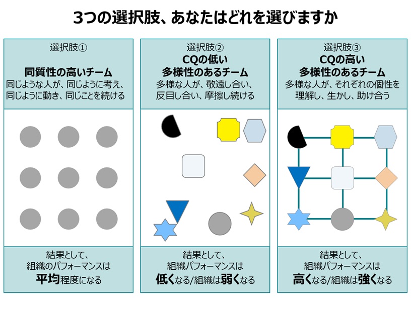 そうであるならば、真剣に選択肢③を考えるべきなのでしょう。すなわち、多様な人が、それぞれの個性・特長・ユニークネスを理解し、それを生かせる場面・状況を作り、助け合う組織です。そのために必要なのがCQ(Cultural Intelligence、文化知性)です。CQとは文化背景の異なる人々と協働し、成果を出す力のことです。この続きは、また別のブログで。