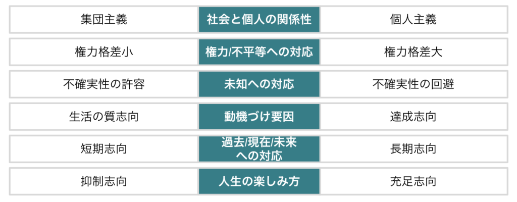博士はこの「当たり前」の違いを、統計的なデータに基づき以下の6つの次元で説明するモデルを考案し、国ごとの特徴を数値化しました。